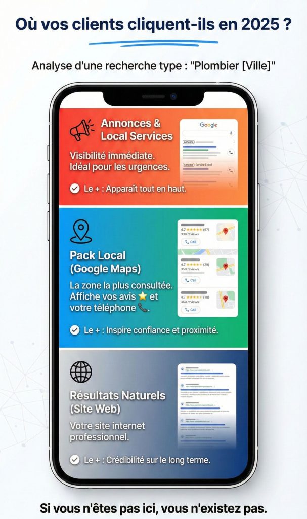 | Zone 1 (Haut) | Annonces Local Services | Payant (au lead) | Apparaît tout en haut, badge « Protection Google », confiance maximale. |